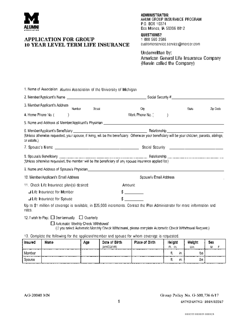 ADMINISTRATOR AAU GROUP INSURANCE PROGRAM P.O. BOX 10374 Des Moines, IA 503068812APPLICATION FOR GROUP 10 YEAR LEVEL TERM LIFE INSURANCEQUESTIONS? 18885602586 customerservice.service@mercer.comUnderwritten