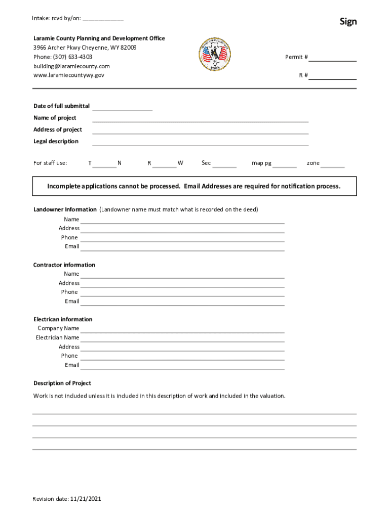 Intake: RCD by/on: ___Sign Laramie County Planning and Development Office 3966 Archer Pkwy Cheyenne, WY 82009 Phone: (307) 6334303 building@laramiecounty.com www.laramiecountywy.govPermit # R#Date