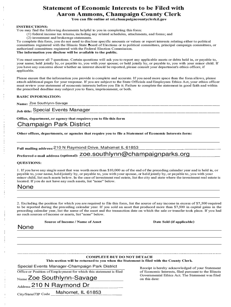 Statement of Economic Interests to be Filed with Aaron Among, Champaign County Clerk You can file online at set.champaigncountyclerkil.instructions: You may find the following documents helpful to