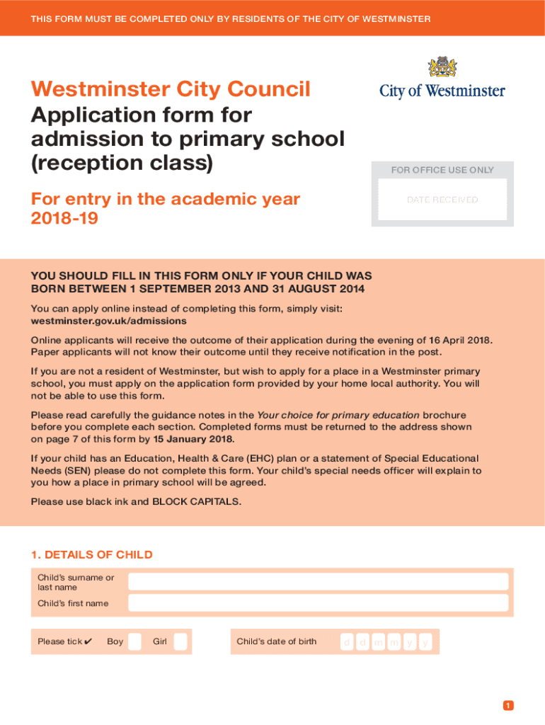 THIS FORM MUST BE COMPLETED ONLY BY RESIDENTS OF THE CITY OF WESTMINSTERWestminster City Council Application form for admission to primary school (reception class) For entry in the academic year 201819FOR