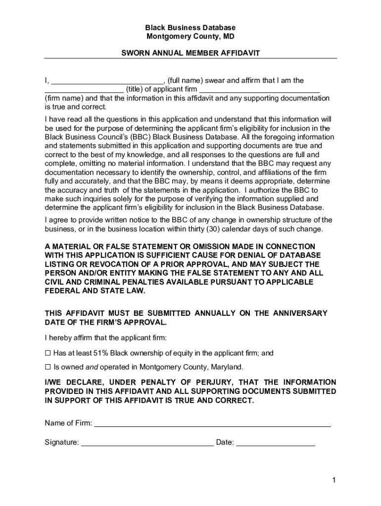 Black Business Database Montgomery County, MD SWORN ANNUAL MEMBER AFFIDAVIT I, ___, (full name) swear and affirm that I am the ___ (title) of applicant firm ___ (firm name) and that the information