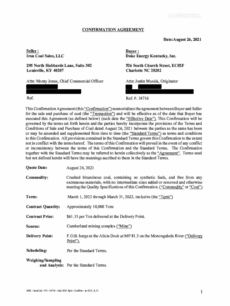 CONFIRMATION AGREEMENT Date:August 26, 2021, Seller: Iron Coal Sales, Lecturer: Duke Energy Kentucky, Inc.295 North Hubbard's Lane, Suite 302 Louisville, KY 40207526 South Church Street, EC02F Charlotte