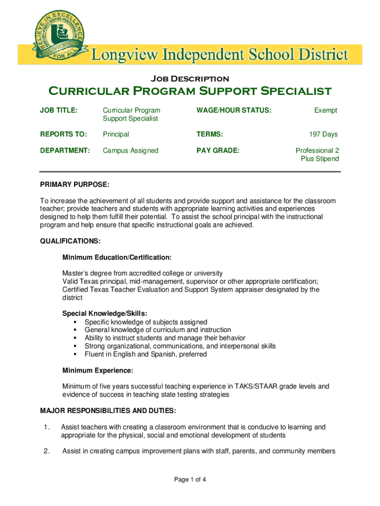 Job DescriptionCurricular Program Support Specialist JOB TITLE:Curricular Program Support SpecialistWAGE/HOUR STATUS:REPORTS TO:Principates:DEPARTMENT:Campus Assigned GRADE:Exempt197 Days Professional