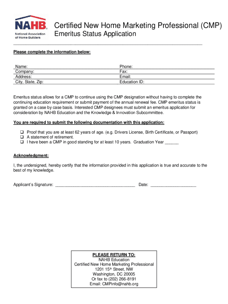 Certified New Home Marketing Professional (CMP) Emeritus Status Application ___ Please complete the information below:Name: Company: Address: City, State, Zip:Phone: Fax: Email: Education ID:Emeritus