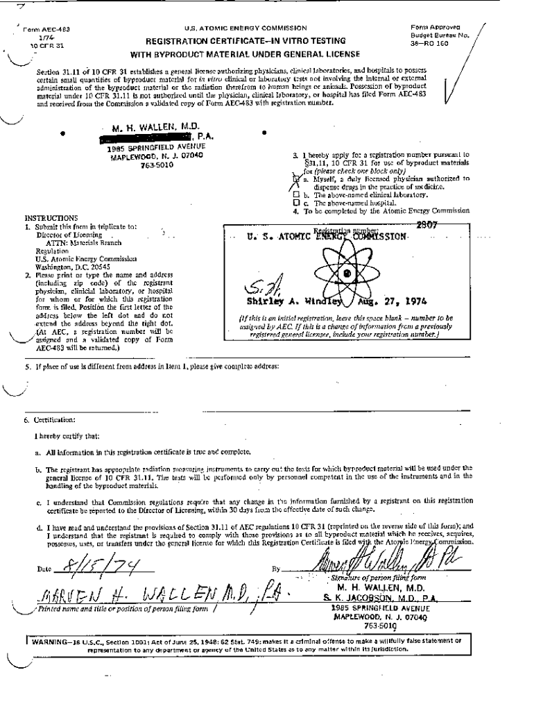 Form Approved Budget Bureau No. 38RO 160U. S. ATOMIC ENERGY Commissioner AEC483 1/74 10 CFR 31REGISTRATION CERTIFICATE IN VITO TESTING WITH BYPRODUCT MATERIAL UNDER GENERAL LICENSESection 31.11 of