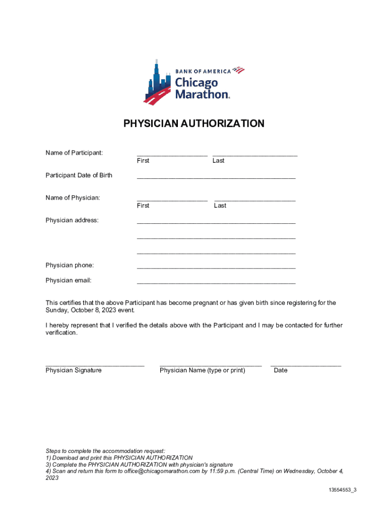 PHYSICIAN AUTHORIZATION Name of Participant:___ ___ First LastParticipant Date of Birth___Name of Physician:___ FirstPhysician address:______ Last___ ___ Physician phone:___Physician email:___This