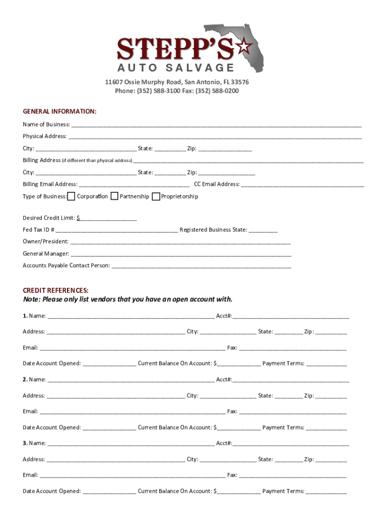 AUTO SALVAGE 11607 Essie Murphy Road, San Antonio, FL 33576 Phone: (352) 5883100 Fax: (352) 5880200 GENERAL INFORMATION: Name of Business: ___ Physical Address: ___ City: ___ State: ___ Zip: ___ Billing