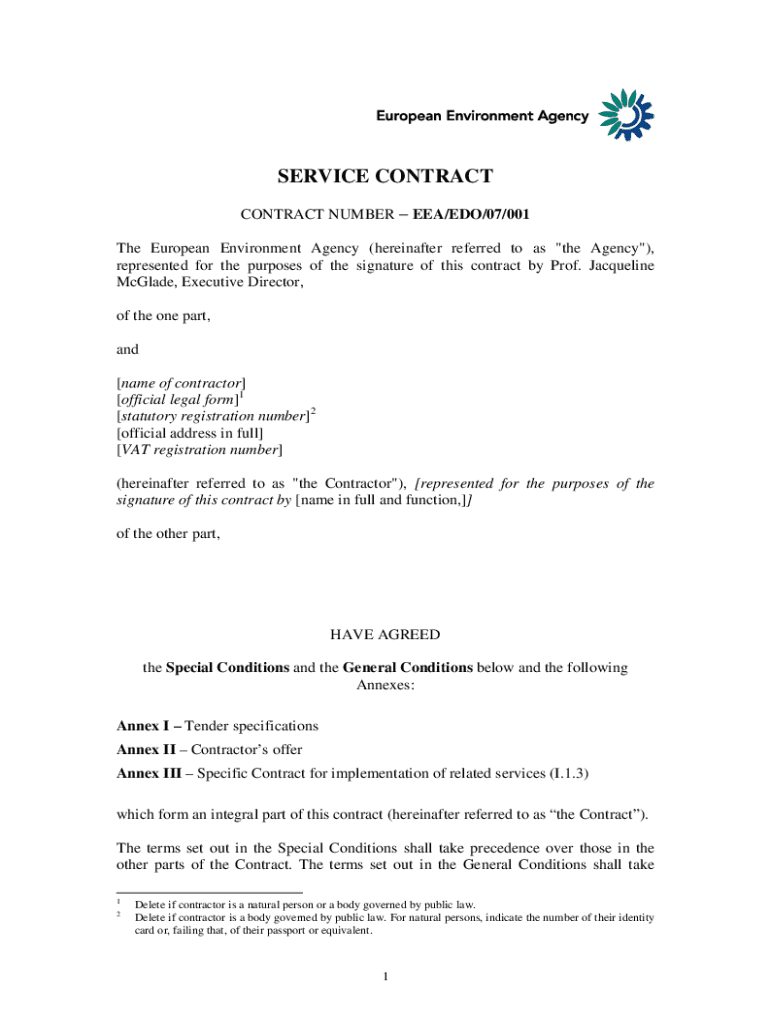 SERVICE CONTRACT NUMBER EEA/DO/07/001 The European Environment Agency (hereinafter referred to as \” the Agency\”), represented for the purposes of the signature of this contract by Prof. Jacqueline