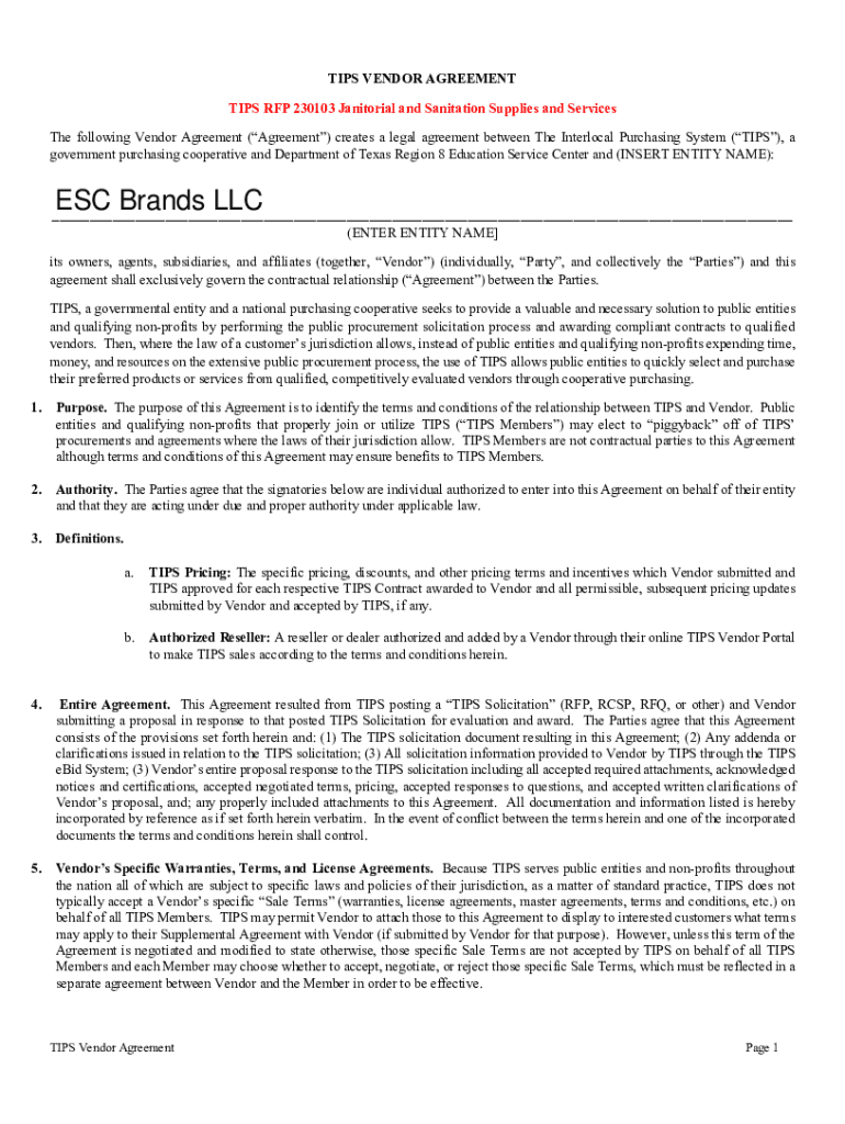 TIPS VENDOR AGREEMENT TIPS RFP 230103 Janitorial and Sanitation Supplies and Services The following Vendor Agreement (Agreement) creates a legal agreement between The Interlocal Purchasing System