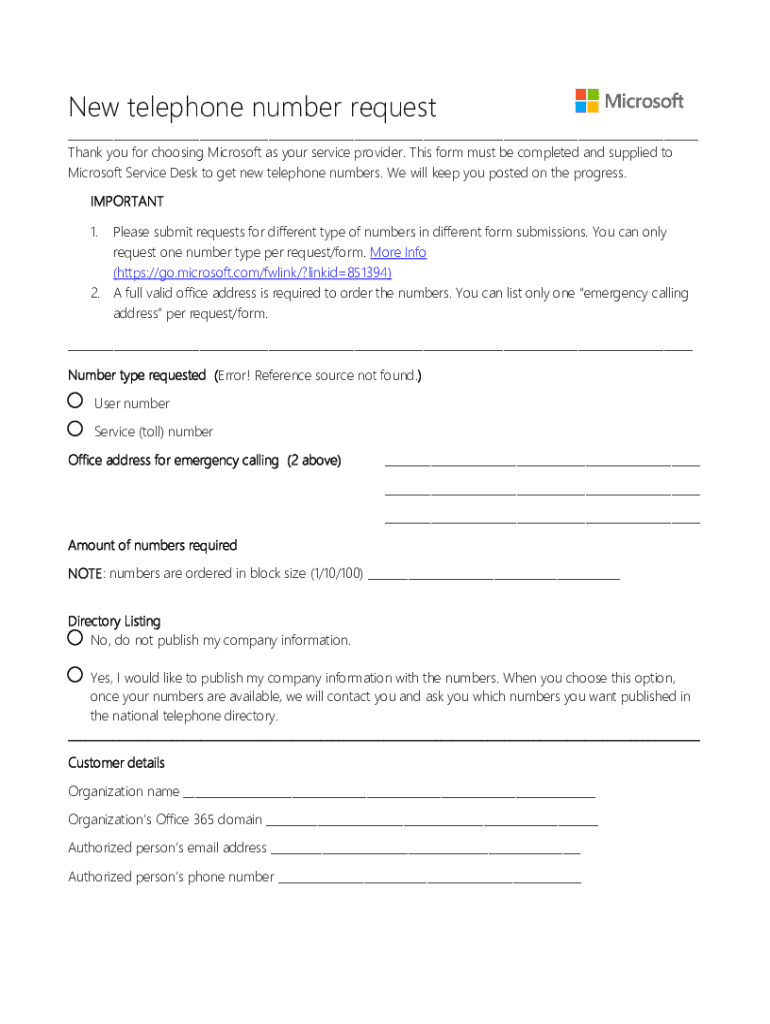 New telephone number request ___ Thank you for choosing Microsoft as your service provider. This form must be completed and supplied to Microsoft Service Desk to get new telephone numbers. We will