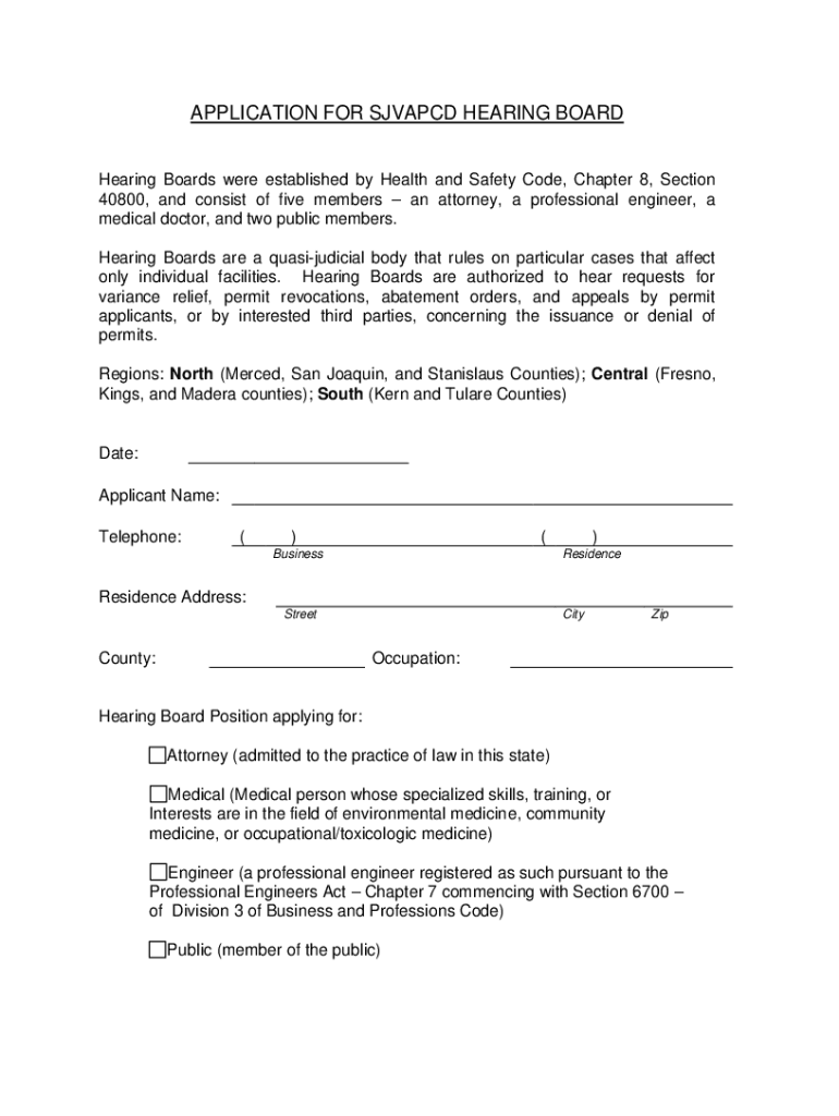 APPLICATION FOR SHAPED HEARING BOARD Hearing Boards were established by Health and Safety Code, Chapter 8, Section 40800, and consist of five members an attorney, a professional engineer, a medical
