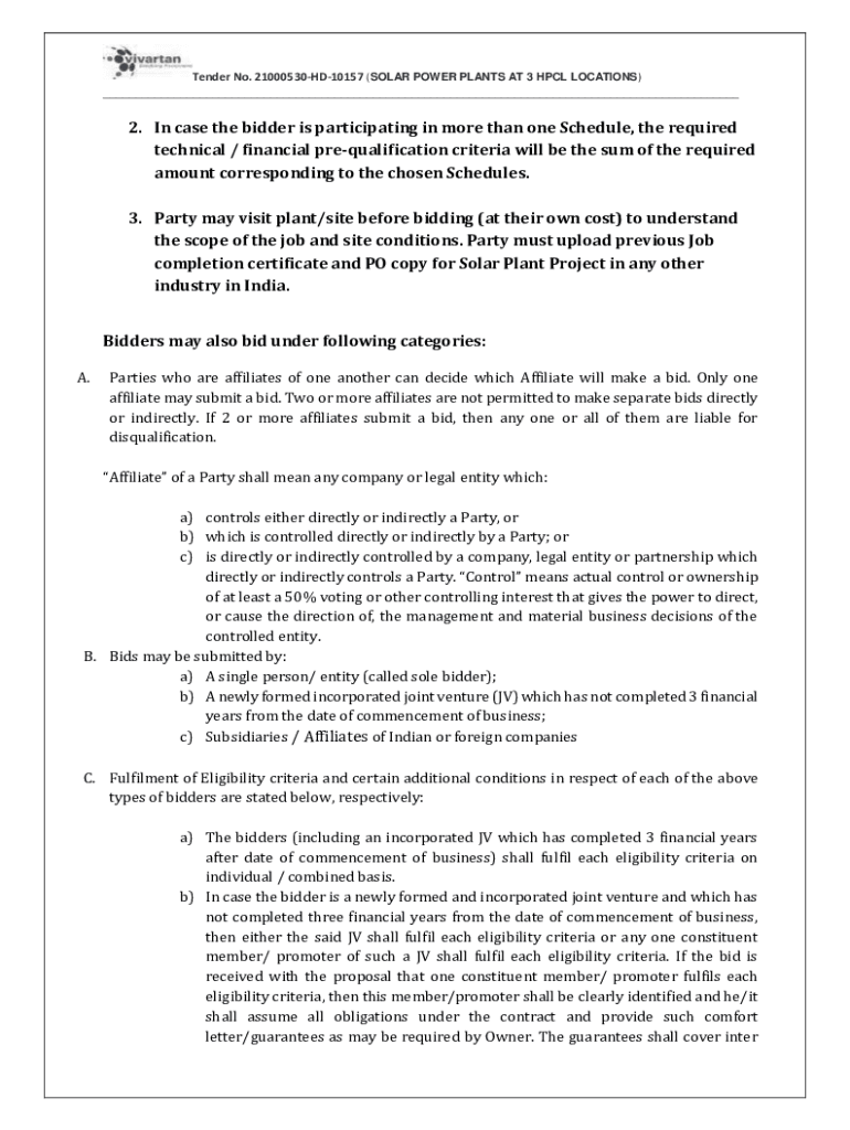 Tender No. 21000530HD10157 (SOLAR POWER PLANTS AT 3 HCL LOCATIONS) ___2. In case the bidder is participating in more than one Schedule, the required technical / financial prequalification criteria
