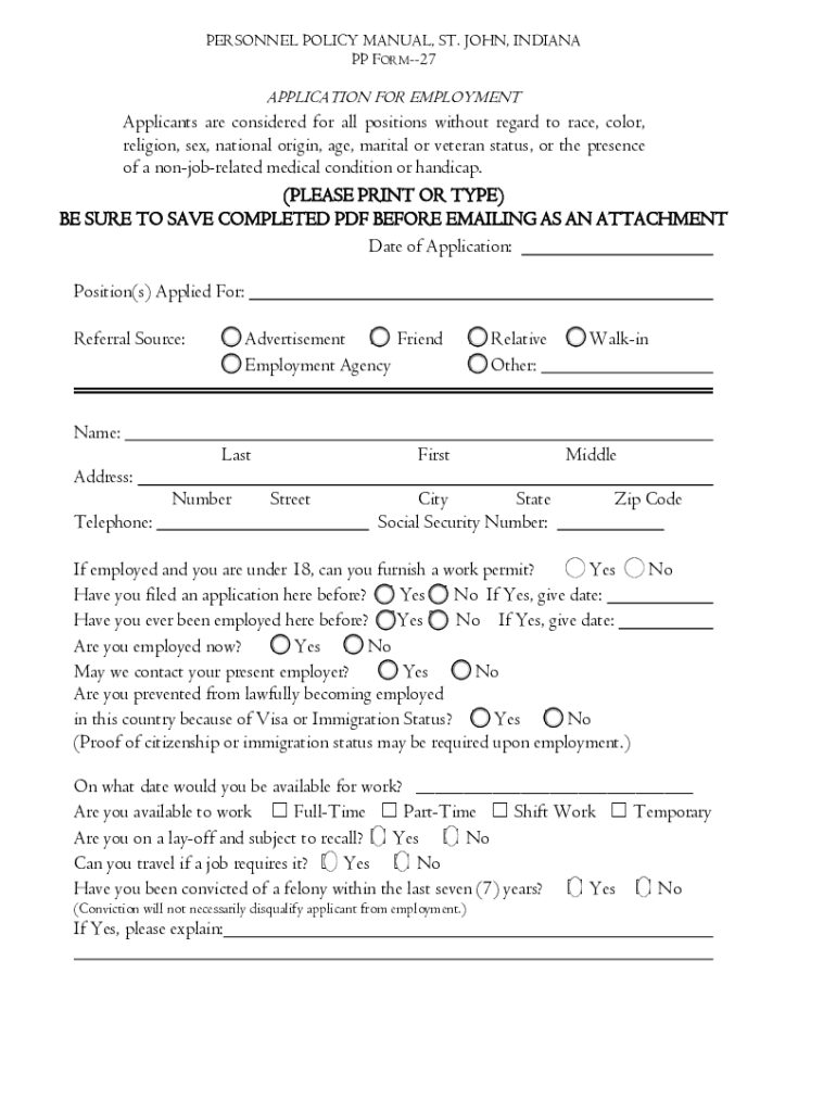PERSONNEL POLICY MANUAL, ST. JOHN, INDIANA PP FORM27APPLICATION FOR EMPLOYMENTApplicants are considered for all positions without regard to race, color, religion, sex, national origin, age, marital