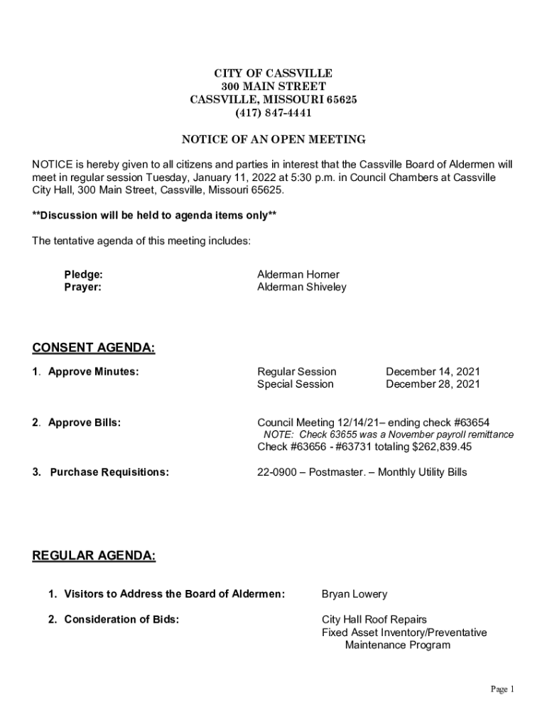 CITY OF NASHVILLE 300 MAIN STREET NASHVILLE, MISSOURI 65625 (417) 8474441 NOTICE OF AN OPEN MEETING NOTICE is hereby given to all citizens and parties in interest that the Nashville Board of Aldermen