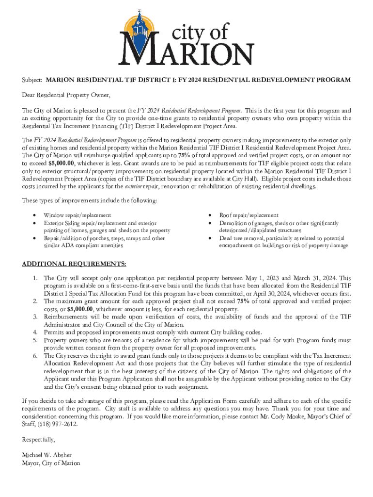 Subject: MARION RESIDENTIAL TIF DISTRICT I: FY 2024 RESIDENTIAL REDEVELOPMENT PROGRAM Dear Residential Property Owner, The City of Marion is pleased to present the FY 2024 Residential Redevelopment