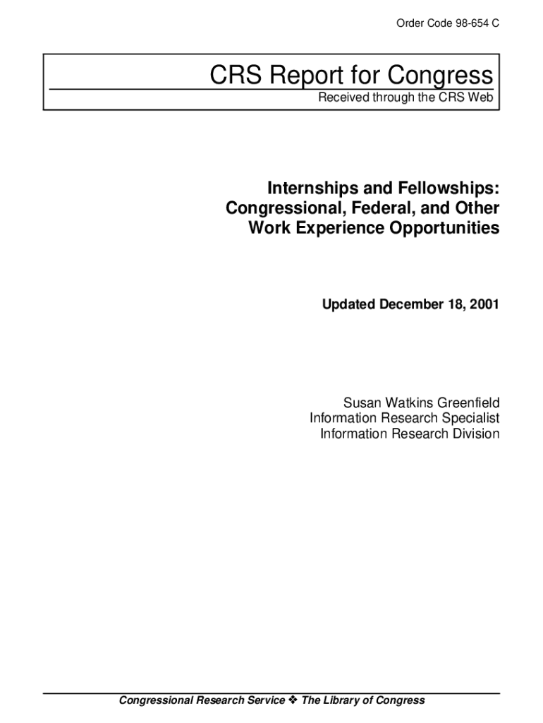 Order Code 98654 CARS Report for Congress Received through the CRS Internships and Fellowships: Congressional, Federal, and Other Work Experience OpportunitiesUpdated December 18, 2001Susan Watkins