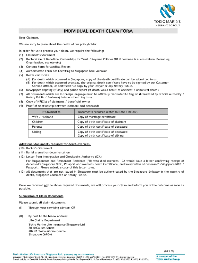 INDIVIDUAL DEATH CLAIM FORM Dear Claimant, We are sorry to learn about the death of our policyholder. In order for us to process your claim, we require the following: (1) (2) (3) (4) (5)(6) (7) (8)