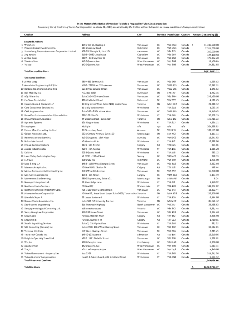 Preliminary List of Creditors of Yukon Zinc Corporation as at July 31, 2019, as submitted by the Debtor without