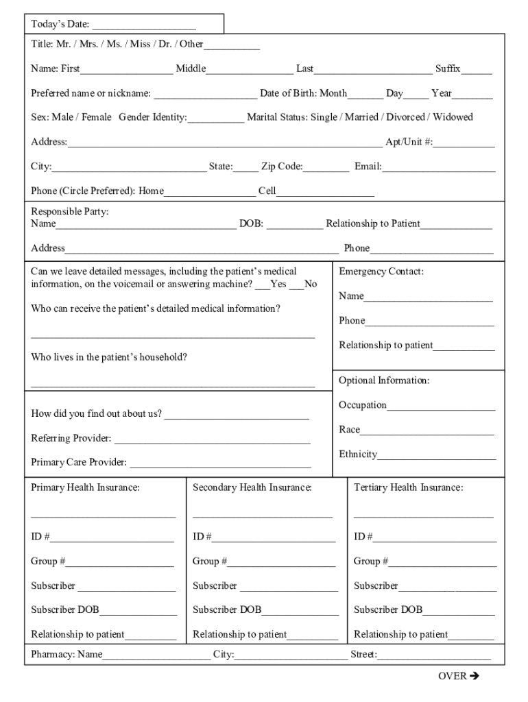 Today's Date: ___ Title: Mr. / Mrs. / Ms. / Miss / Dr. / Other___ Name: First___ Middle___ Last___ Suffix___ Preferred name or nickname: ___ Date of Birth: Month___ Day___ Year___ Sex: Male / Female