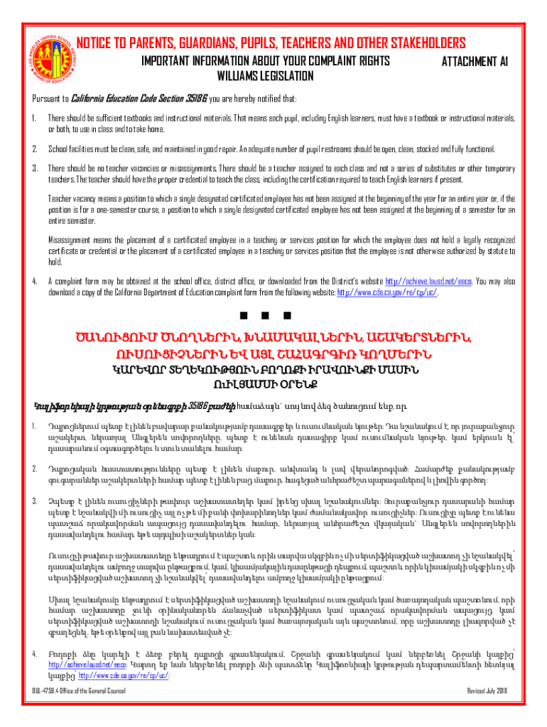 NOTICE TO Parent, GUARDIANS, PUPILS, TEACHERS AND OTHER STAKEHOLDERS IMPORTANT INFORMATION ABOUT YOUR COMPLAINT RIGHTS WILLIAMS LEGISLATIONATTACHMENT A1Pursuant to California Education Code Section