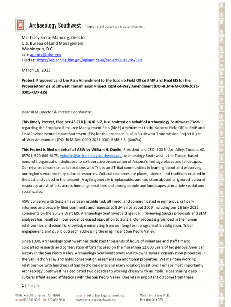 Ms. Tracy Stone Manning, Director U.S. Bureau of Land Management Washington, D.C. c/o: apautz@blm.gov Filed at : https://eplanning.blm.gov/eplanningui/project/2011785/510March 18, 2023 Protest: Proposed