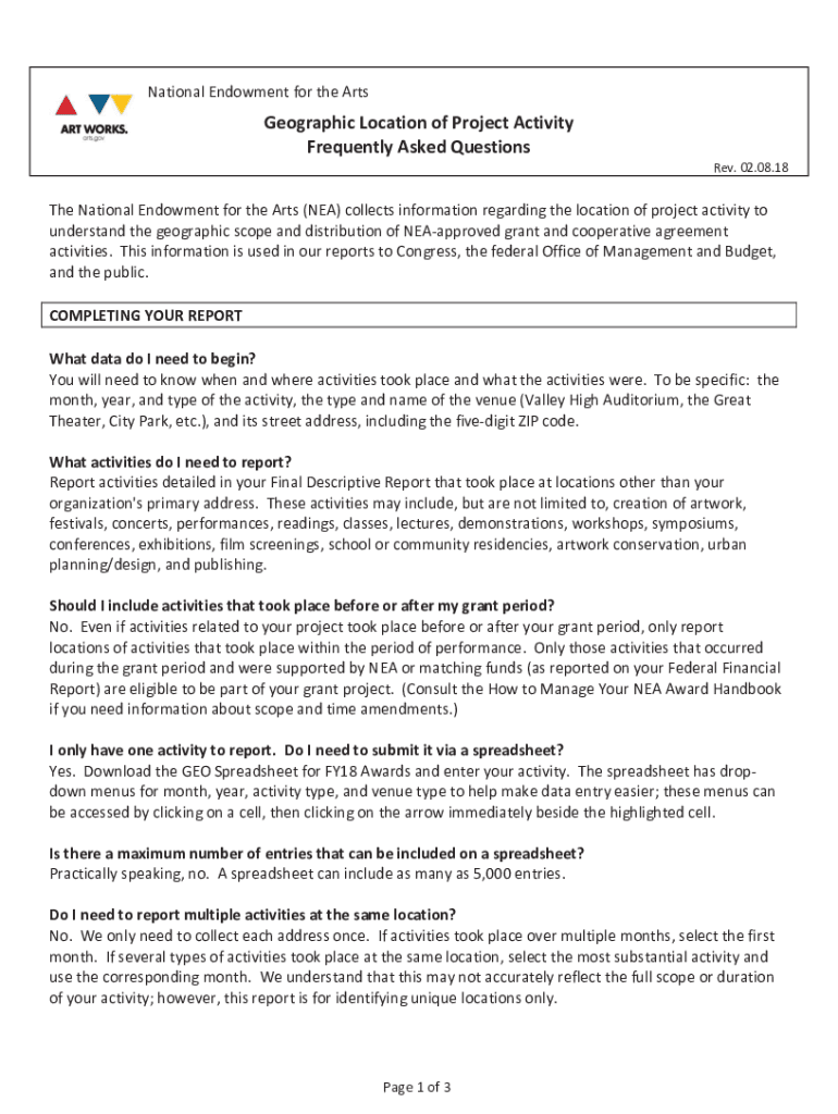 National Endowment for the Arteriographic Location of Project Activity Frequently Asked Questions Rev. 02.08.18The National Endowment for the Arts (NEA) collects information regarding the location
