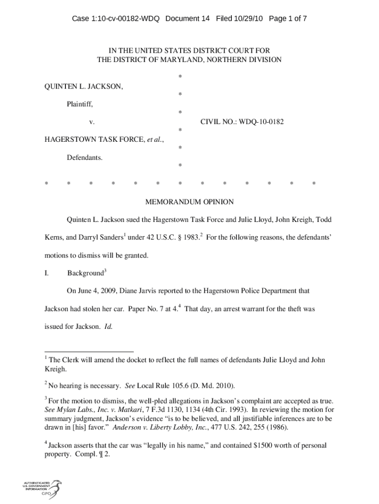 Case 1:10cv00182WDQ Document 14 Filed 10/29/10-Page 1 of 7IN THE UNITED STATES DISTRICT COURT FOR THE DISTRICT OF MARYLAND, NORTHERN DIVISION * QUINTET L. JACKSON, * Plaintiff, * v.CIVIL NO.: WDQ100182