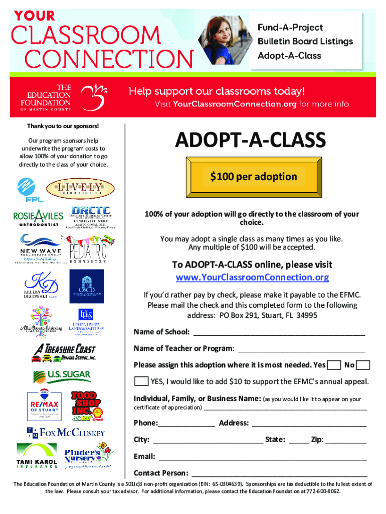 Thank you to our sponsors! Our program sponsors help underwrite the program costs to allow 100% of your donation to go directly to the class of your choice.ADOPTACLASS $100 per adoption 100% of your