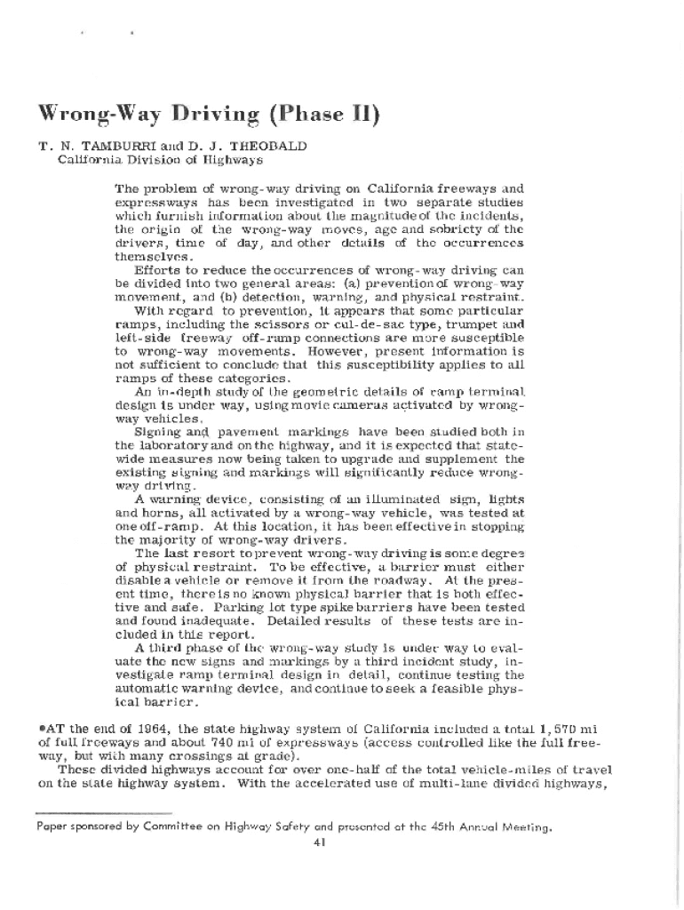 Wrongly Driving (Phase II) T. N. HAMBURG and D. J. THEOBALD California Division of Highways The problem of wrong way driving on California freeways and expressways has been investigated in two separate