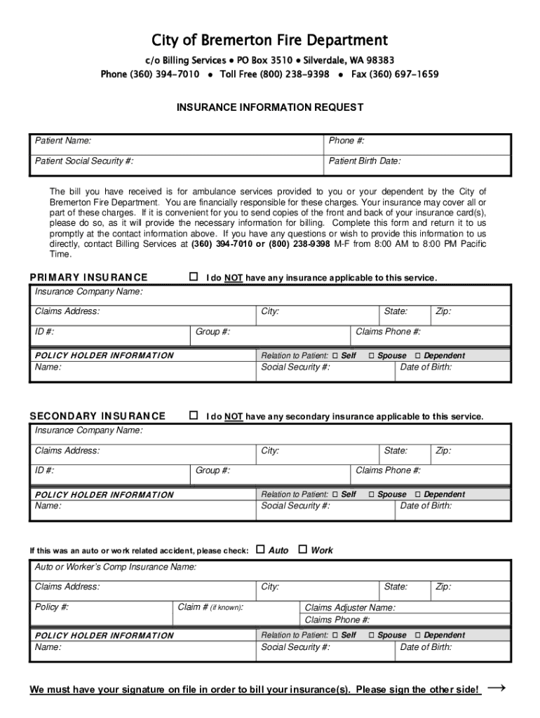 City of Bremerton Fire Department c/o Billing ServicesPhone (360) 3947010TollPO Box 3510Silverdale, WA 98383Free (800) 2389398Fax (360) 6971659INSURANCE INFORMATION REQUEST Patient Name:Phone #:Patient