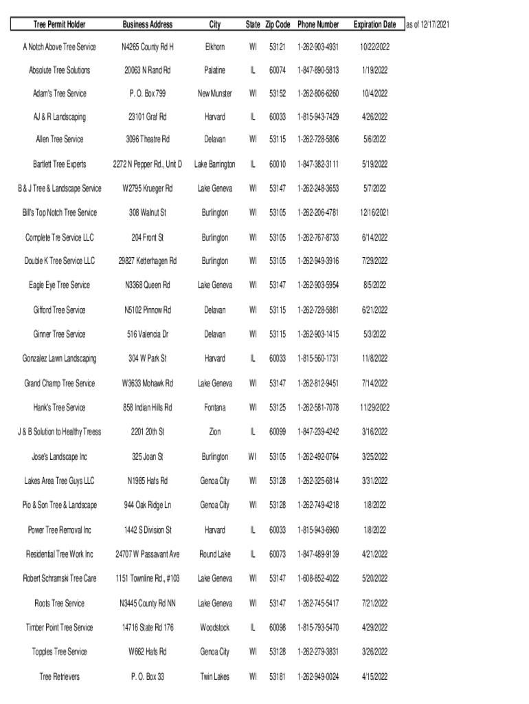 Tree Permit HolderBusiness AddressCityState Zip Telephone NumberExpiration Data Notch Above Tree ServiceN4265 County Rd HElkhornWI531211262903493110/22/2022Absolute Tree Solutions20063 N Rand RdPalatineIL60074184789058131/19/2022Adam\'s
