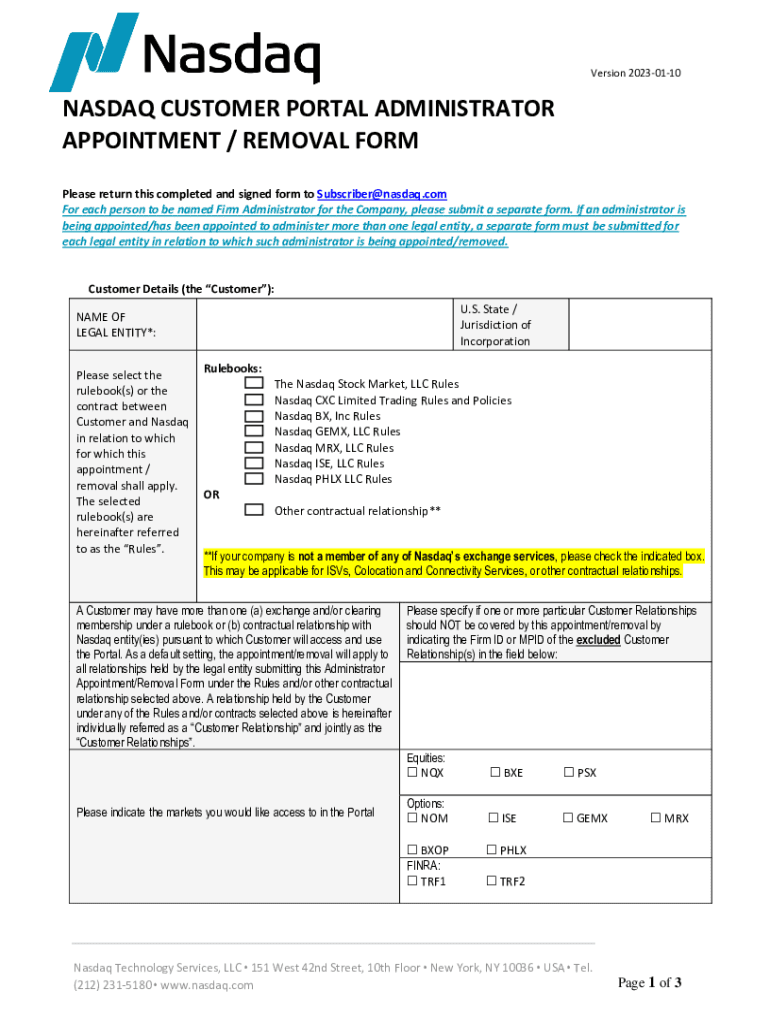 Version 20230110NASDAQ CUSTOMER PORTAL ADMINISTRATOR APPOINTMENT / REMOVAL FORM Please return this completed and signed form to Subscriber@nasdaq.com For each person to be named Firm Administrator