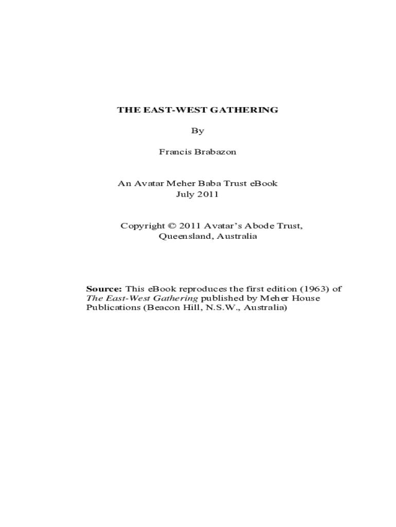 THE FASTEST GATHERING By Francis BrabazonAn Avatar Meter Baba Trust e-book July 2011Copyright 2011 Avatars Abode Trust, Queensland, AustraliaSource: This e-book reproduces the first edition (1963)