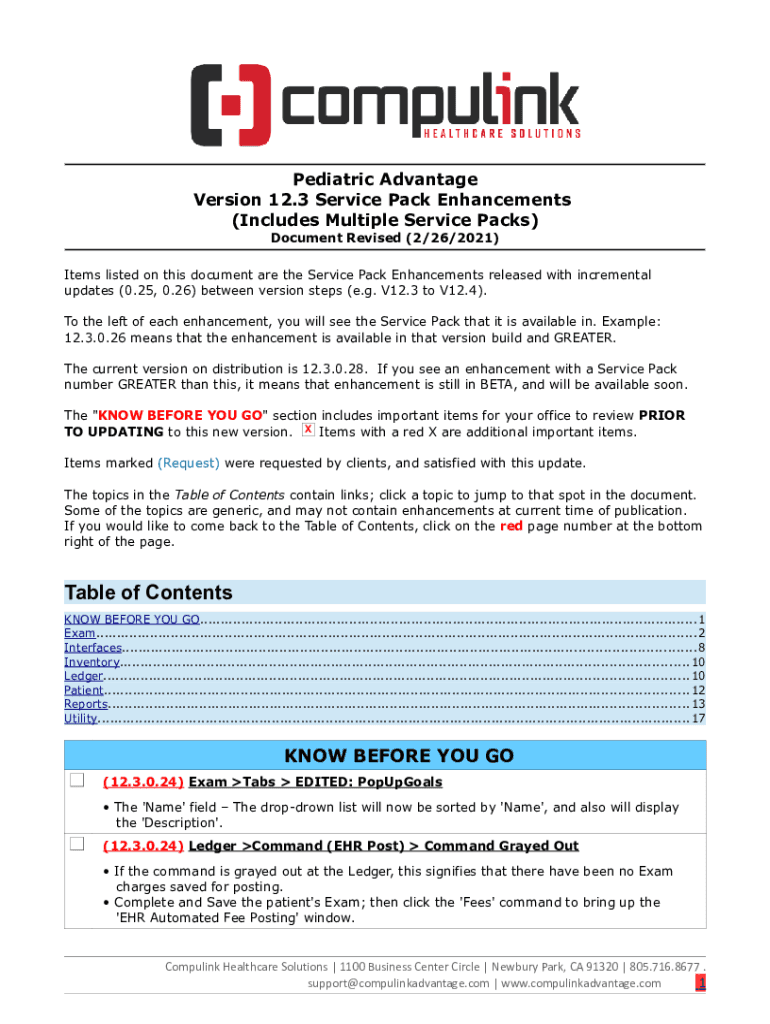 Pediatric Advantage Version 12.3 Service Pack Enhancements (Includes Multiple Service Packs) Document Revised (2/26/2021) Items listed on this document are the Service Pack Enhancements released with