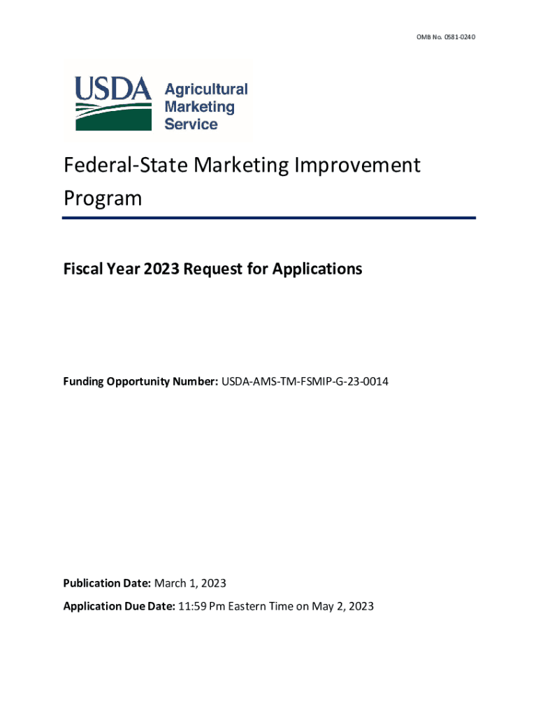 Fiscal Year 2023 Request for ApplicationsFunding Opportunity Number: USDAAMSTMFSMIPG230014Publication Date: March 1, 2023,