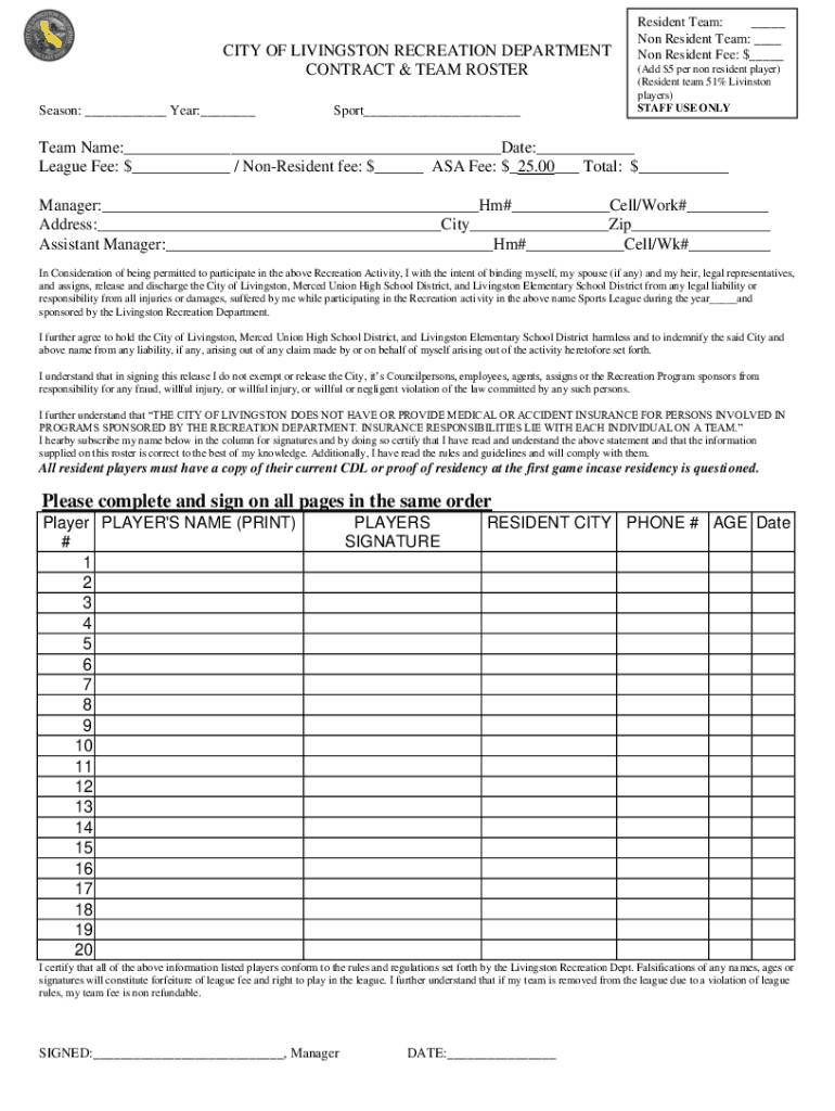CITY OF LIVINGSTON RECREATION DEPARTMENT CONTRACT & TEAM ROSTER Season: ___ Year:___Sport___Resident Team: ___ Non-Resident Team: ___ Non-Resident Fee: $___ (Add $5 per non-resident player) (Resident