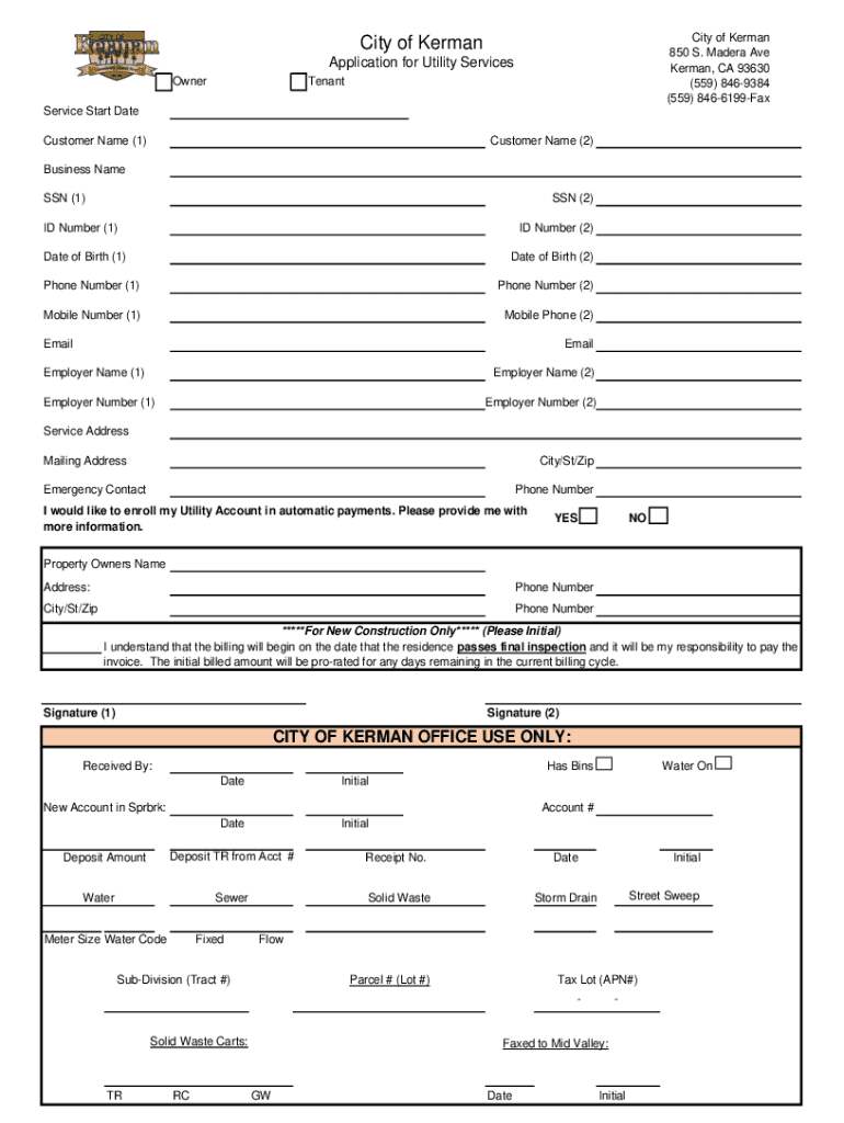 CHECKLIST FOR UTILITY APPLICATIONS: PROPERTY OWNER: Complete Utility Application Copy of a photo ID Proof of Ownership Such as escrow, loan, insurance documents, etc. TENANT: Complete Utility Application