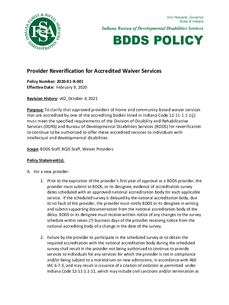 Eric Holcomb, Governor State of Indiana Bureau of Developmental Disabilities ServicesBDDS POLICYProvider Reverification for Accredited Waiver Services Policy Number: 202001R001 Effective Date: February
