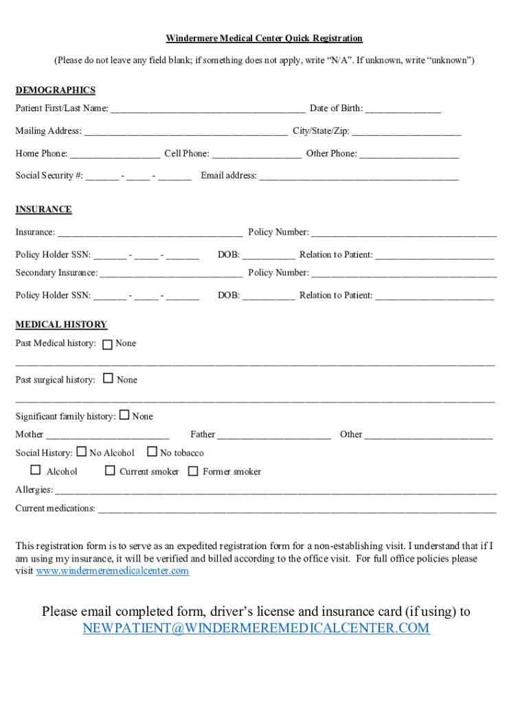 Winder mere Medical Center Quick Registration (Please do not leave any field blank; if something does not apply, write N/A. If unknown, write unknown) DEMOGRAPHICS Patient First/Last Name: ___ Date