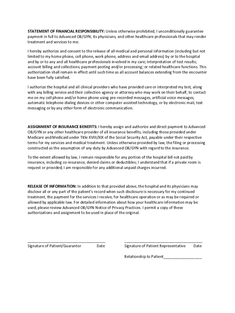 STATEMENT OF FINANCIAL RESPONSIBILITY: Unless otherwise prohibited, I unconditionally guarantee payment in full to Advanced OB/GUN, its physicians, and other healthcare professionals that may render