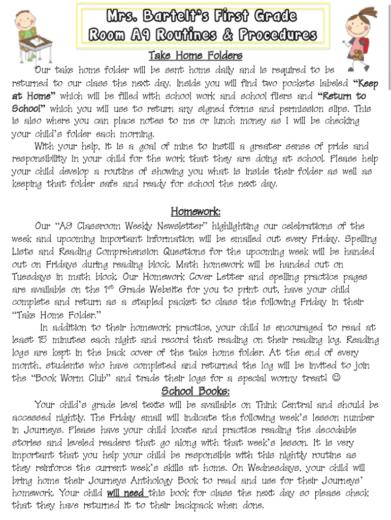 Mrs. Barrels First Grade Room A9 Routines & Procedures Take Home Folders Our take home folder will be sent home daily and is required to be returned to our class the next day. Inside you will find