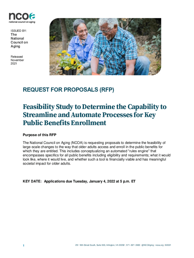 ISSUED BY:The National Council on Aging Released November 2021REQUEST FOR PROPOSALS (RFP)Feasibility Study to Determine the Capability to Streamline and Automate Processes for Key Public Benefits
