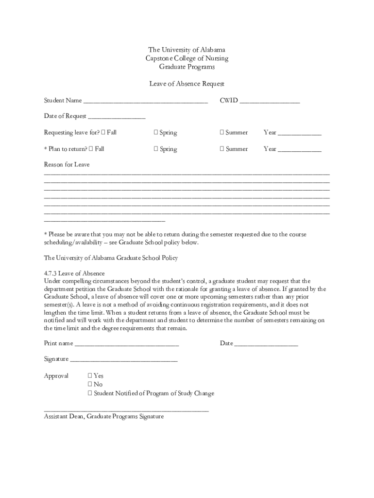 Get the free Leave of Absence Request - Capstone College of Nursing