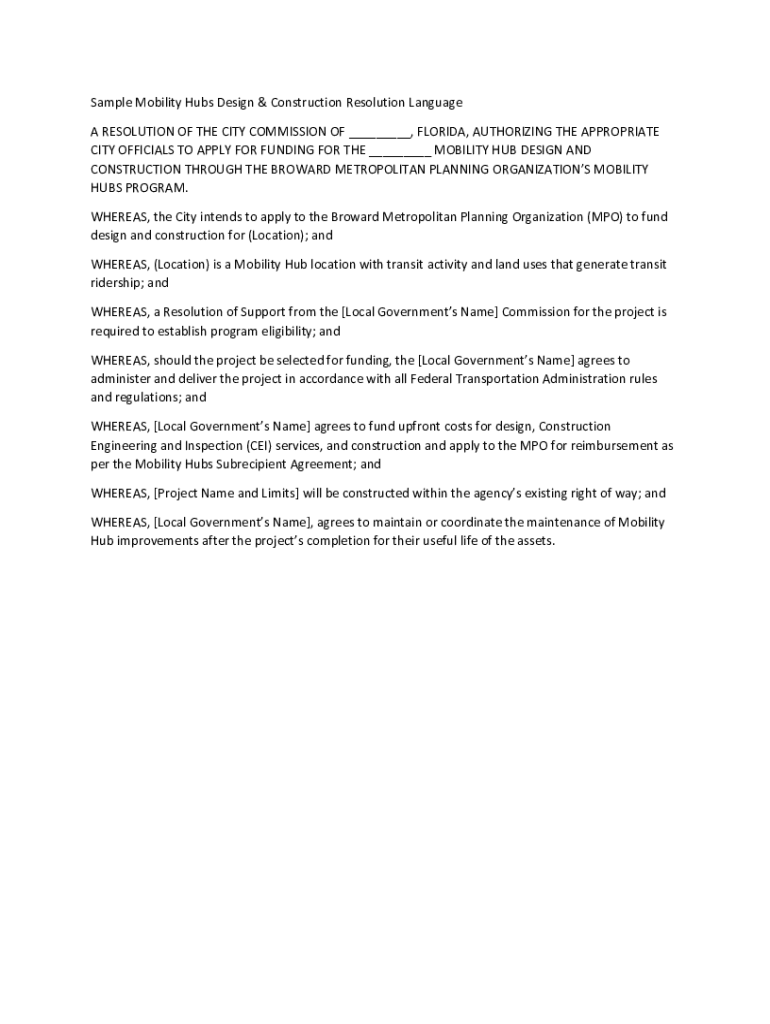 Sample Mobility Hubs Design & Construction Resolution Language A RESOLUTION OF THE CITY COMMISSION OF ___, FLORIDA, AUTHORIZING THE APPROPRIATE CITY OFFICIALS TO APPLY FOR FUNDING FOR THE ___ MOBILITY