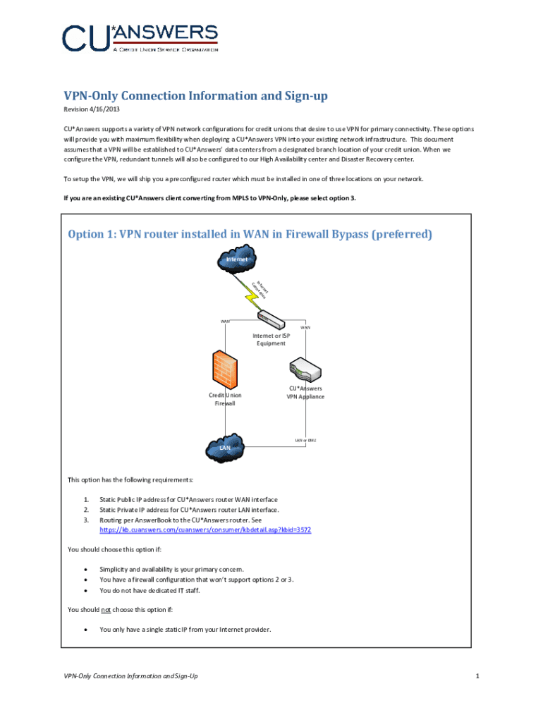 Only Connection Information and SignupRevision 4/16/2013 CU×Answers supports a variety of VPN network configurations for credit unions that desire to use VPN for primary connectivity. These options