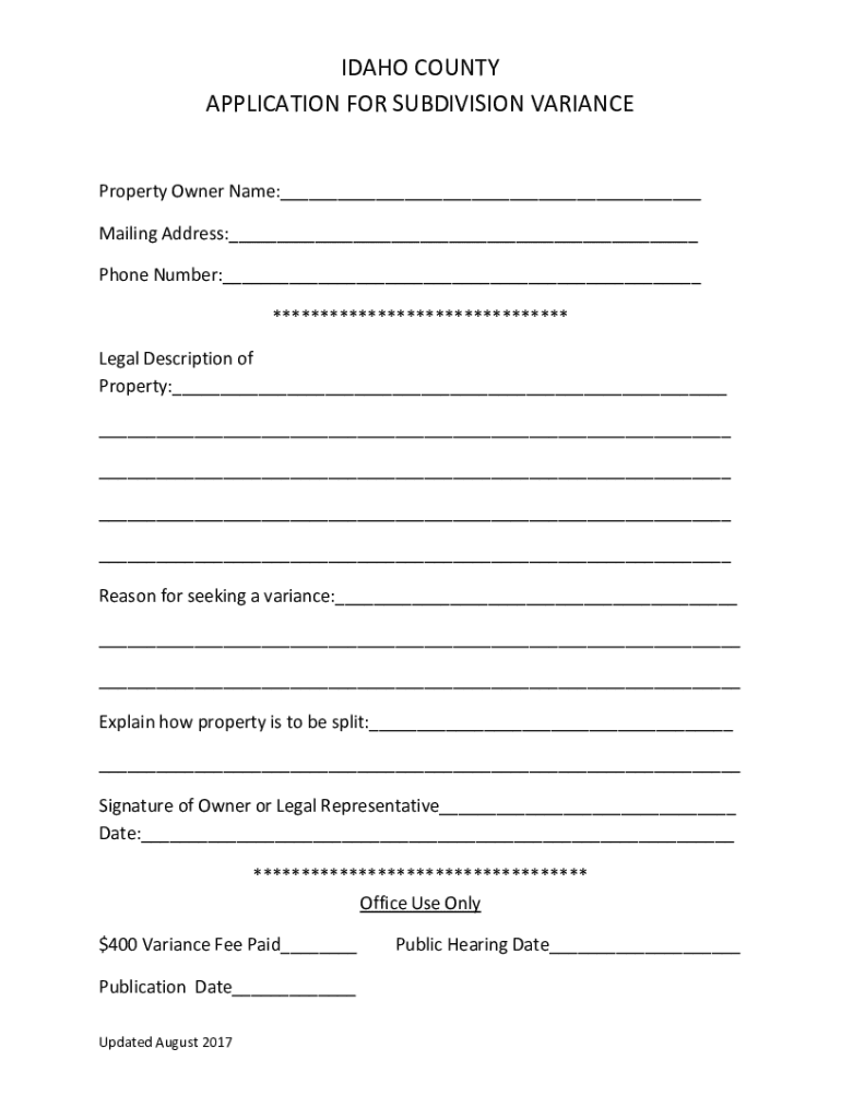IDAHO COUNTY APPLICATION FOR SUBDIVISION VARIANCE Property Owner Name:___ Mailing Address:___ Phone Number:___ ******************************* Legal Description of Property:___ ___ ___ ___ ___ Reason