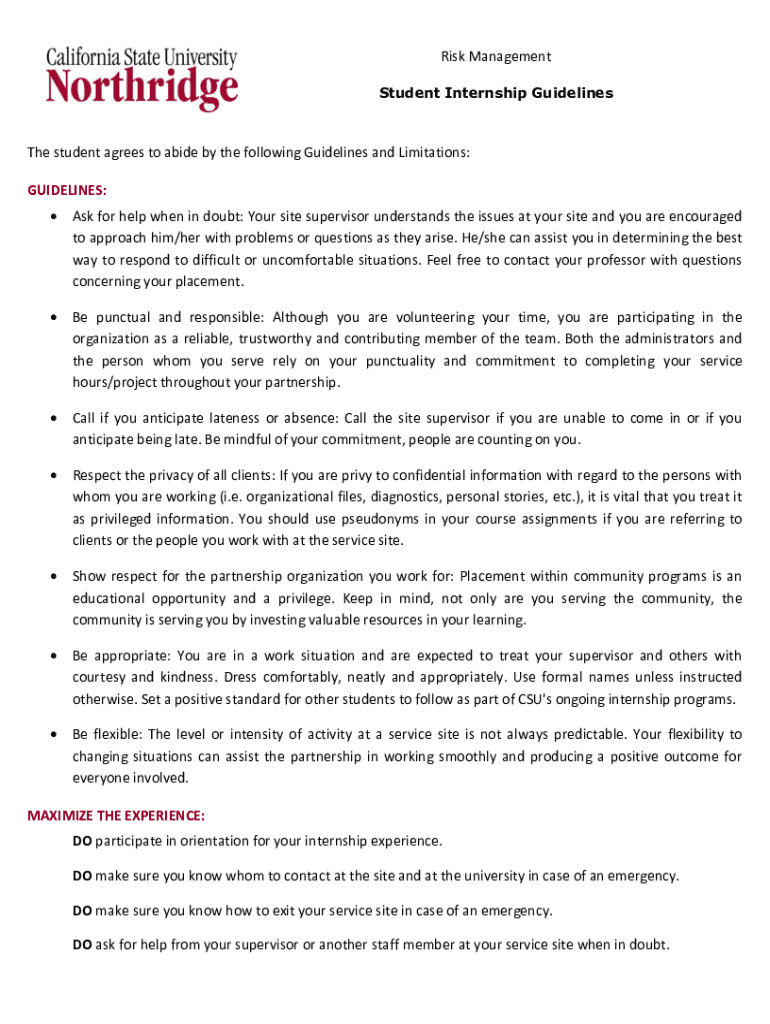 Risk Management Student Internship Guidelines student agrees to abide by the following Guidelines and Limitations: GUIDELINES: Ask for help when in doubt: Your site supervisor understands the issues
