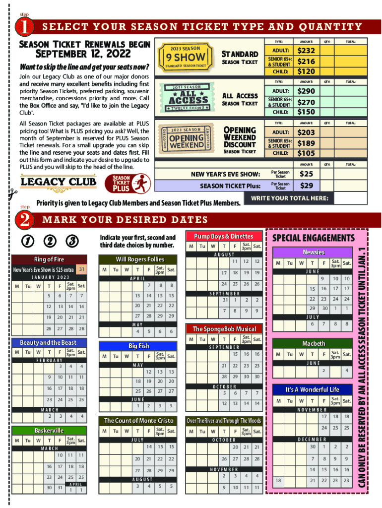Step1SELECT YOUR SEASON TICKET TYPE AND QUANTITYSeason Ticket Renewals tintype:2023 SEASON September 12, 2022Standard9 Showman to skip the line and get your seats now? Season TicketSTANDARD SEASON
