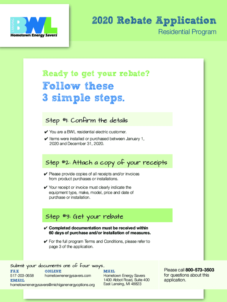 2020 Rebate Application Residential Programmed to get your rebate? Follow these 3 simple steps. Step #1: Confirm the details You are a BWL residential electric customer. Items were installed or purchased