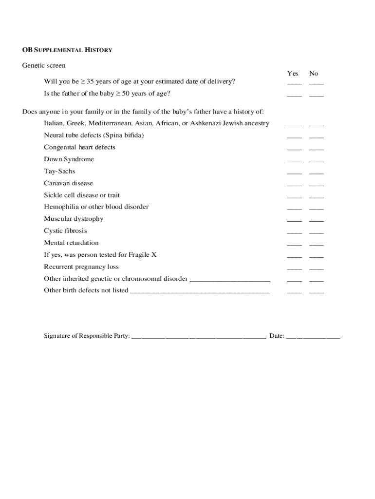 OB SUPPLEMENTAL HISTORY Genetic screen Will you be 35 years of age at your estimated date of delivery? Yes ___No ___Is the father of the baby 50 years of age?______Italian, Greek, Mediterranean, Asian,